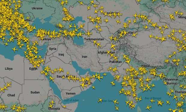 La începutul lui martie, spațiul aerian al Iranului, Irakului, Kuweitului, Iordaniei, Israelului, Siriei și Libanului era complet evitat de avioanele comerciale. Sursa: FlightRadar24 |